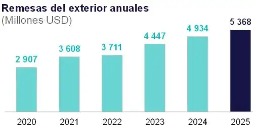 Asimismo, el BCR destacó que las remesas del exterior muestran un crecimiento constante desde 2020, año en el que se registró un nivel de 2,020 millones de dólares. En un periodo de cinco años, el ingreso de divisas por este concepto se ha más que duplicado, reflejando una tendencia ascendente en los flujos de dinero hacia los hogares peruanos.