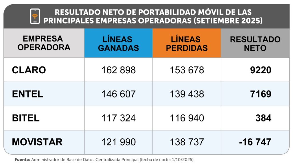De acuerdo a la información proporcionada por el Administrador de Base de Datos Centralizada Principal (ABDCP) al OSIPTEL, por empresa, Claro tuvo el mayor número de portaciones netas positivas (más líneas ganadas que perdidas) con 9220 líneas, seguida de Entel (7169) y Bitel (384). En tanto, Movistar obtuvo un saldo neto negativo de 16 747 líneas.