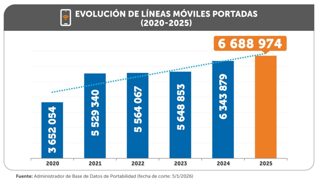 El crecimiento de la portabilidad móvil durante 2025 estuvo impulsado principalmente por el segmento pospago, que alcanzó 4 754 314 líneas portadas, lo que representó el 71.1 % del total de cambios de operador durante ese año.