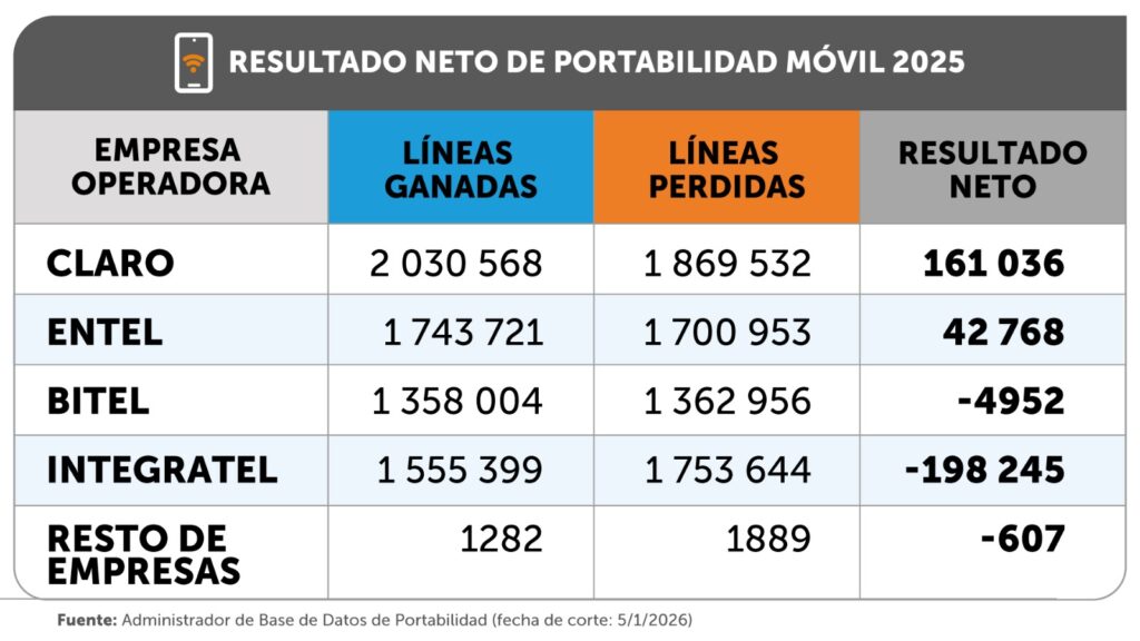 En cuanto al desempeño por empresas, las operadoras que lograron resultados netos positivos (diferencia entre líneas ganadas y perdidas) durante 2025 fueron Claro y Entel, con un saldo favorable de 161 036 y 42 768 líneas móviles a su favor, respectivamente.