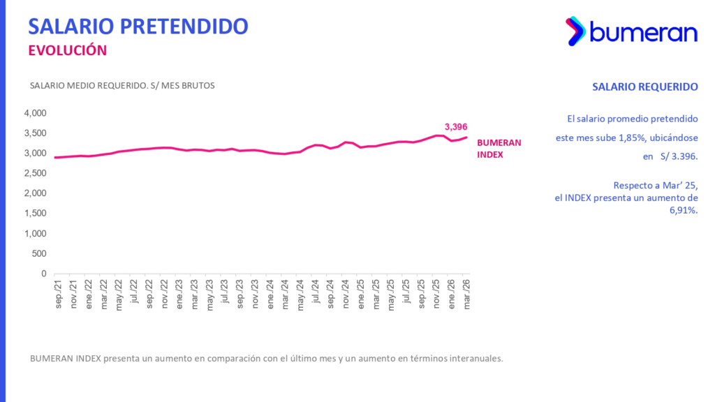 El salario promedio pretendido por los trabajadores en Perú alcanzó los S/ 3,396 mensuales en marzo de 2026, lo que representa un incremento de 1.85% frente al mes anterior. Sin embargo, el primer trimestre del año cerró con una ligera caída acumulada de 1.13%, reflejando variaciones en las expectativas de los postulantes dentro del mercado laboral. El comportamiento evidencia una recuperación parcial tras los movimientos registrados en los primeros meses del año.