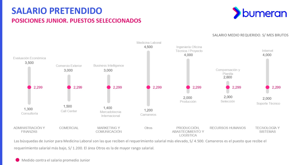 Para los puestos junior, Medicina Laboral lidera con una pretensión de S/ 4,500 mensuales, seguida por Internet y Compensación y Planilla. En el extremo inferior se ubican áreas como Producción, Soporte Técnico y Camareros, con salarios que parten desde S/ 1,200.