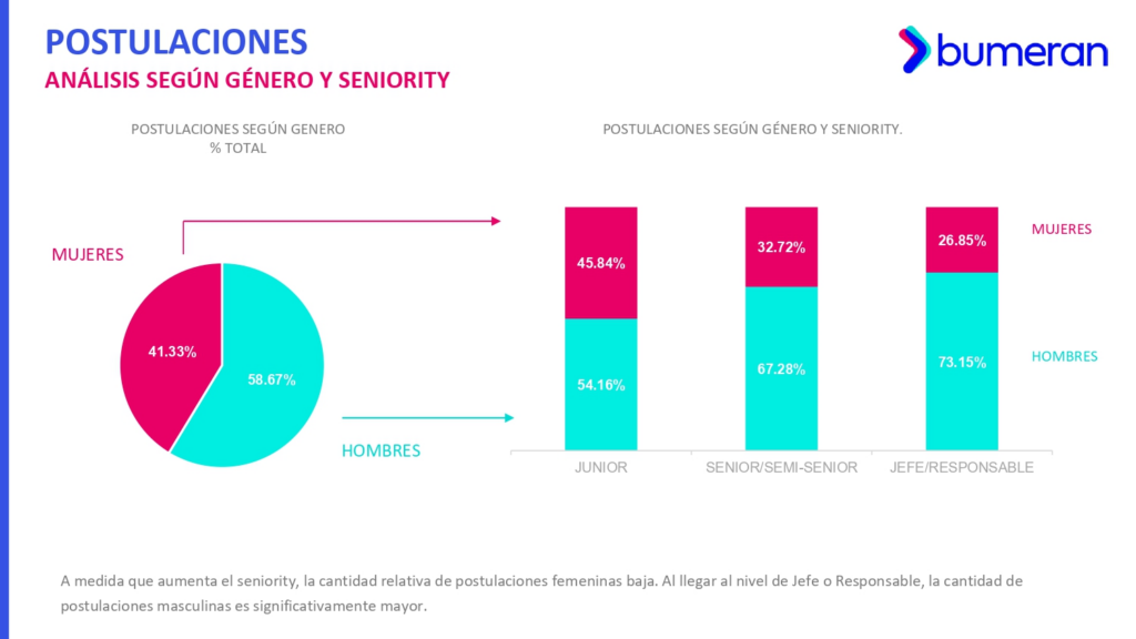 En términos de participación, el 58.67% de las postulaciones corresponde a hombres y el 41.33% a mujeres. La diferencia se amplía conforme aumenta el nivel jerárquico: en puestos junior la participación femenina es de 45.84%, mientras que en niveles semi-senior y senior desciende a 32.72%, y en cargos de jefatura o supervisión llega a 26.85%.